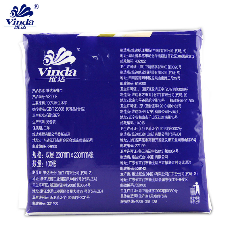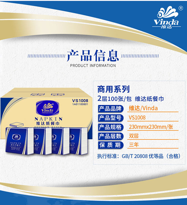 產(chǎn)品名稱 維達VS1008雙層餐巾紙-100張 230*230mm,2層 貨號 QL001302