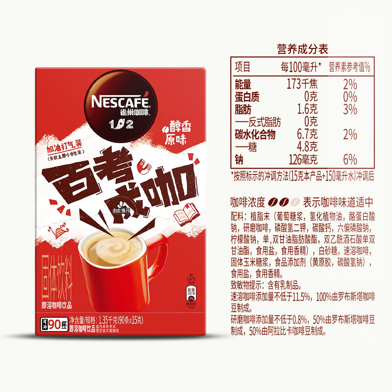 雀巢(Nestle)速溶咖啡 1+2 原味微研磨沖調(diào)飲品90條1350g 高考限定白敬亭同款