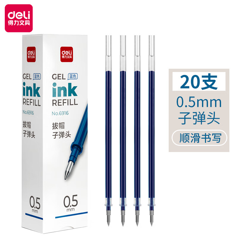 得力(deli)0.5mm藍(lán)色中性筆筆芯 子彈頭水筆簽字筆替芯 20支/盒【6916替芯/20支藍(lán)色】