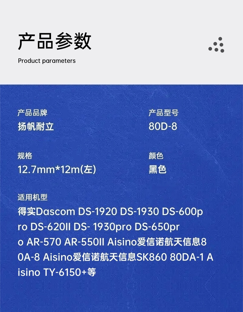 > 辦公耗材 > 針式打印機(jī)耗材 > 通用色帶框 > 揚(yáng)帆耐立 80D-8 色帶架 黑色 12.7mm*12m(左)單支裝(適用得實Dascom DS-1920 DS-1930 DS-600pro DS-620II DS- 1930pro DS-650pro)揚(yáng)帆耐立 80D-8 色帶架 黑色 12.7mm*12m(左)單支裝(適用得實Dascom DS-1920 DS-1930 DS-600pro DS-620II DS- 1930pro DS-650pro)