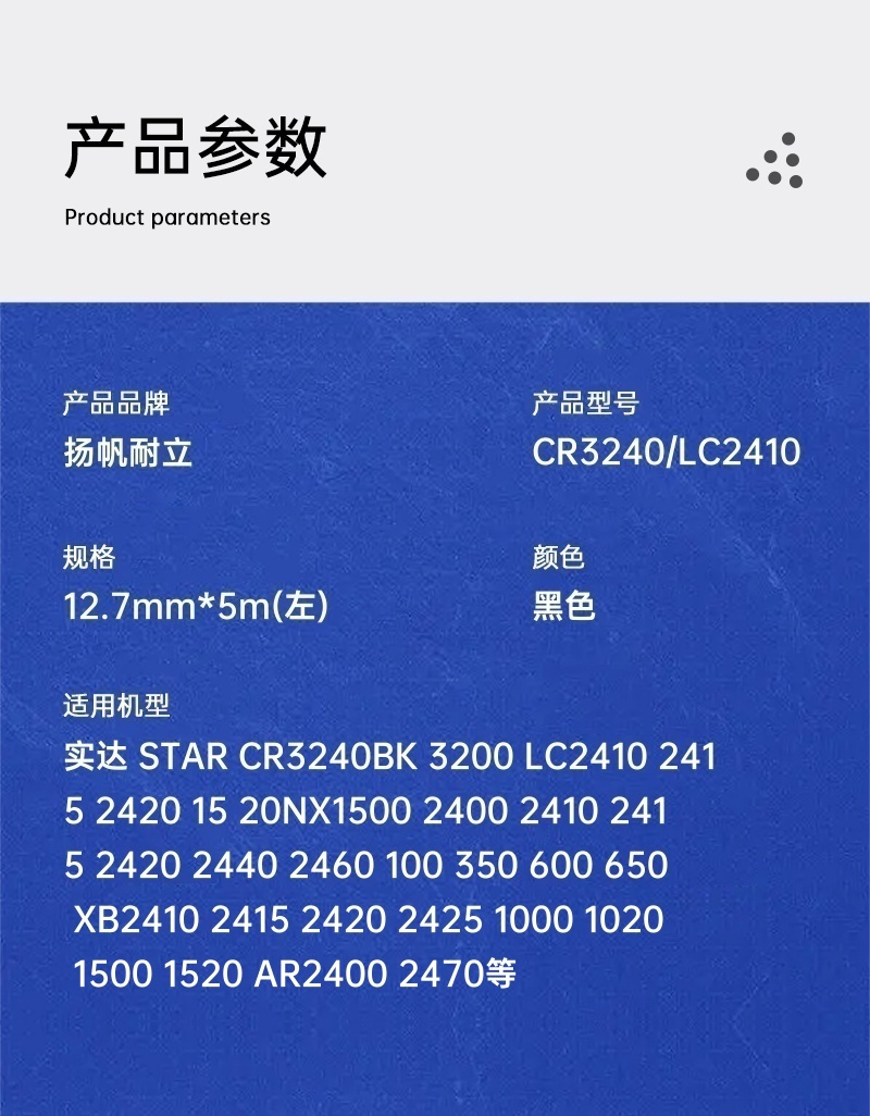 > 辦公耗材 > 針式打印機(jī)耗材 > 通用色帶框 > 揚(yáng)帆耐立 CR3240/LC2410 色帶架 黑色 12.7mm*5m(左)單支裝(適用實(shí)達(dá) STAR CR3240BK 3200 LC2410 2415 2420 15 20NX1500 2400)揚(yáng)帆耐立 CR3240/LC2410 色帶架 黑色 12.7mm*5m(左)單支裝(適用實(shí)達(dá) STAR CR3240BK 3200 LC2410 2415 2420 15 20NX1500 2400)