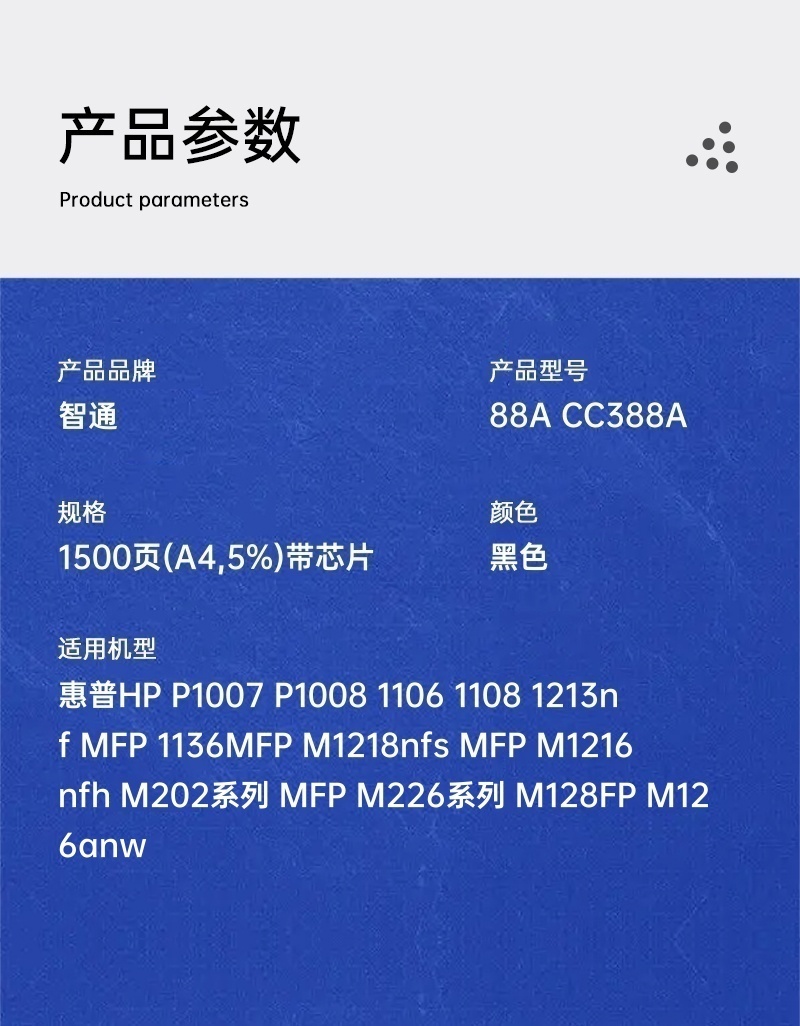 > 辦公耗材 > 打印機(jī)耗材 > 通用硒鼓 > 智通 88A CC388A 硒鼓 帶芯片 黑色 1500頁(yè)(A4,5%)單支裝(適用惠普HP P1007 P1008 1106 1108 1213nf MFP 1136MFP M1218nfs)智通 88A CC388A 硒鼓 帶芯片 黑色 1500頁(yè)(A4,5%)單支裝(適用惠普HP P1007 P1008 1106 1108 1213nf MFP 1136MFP M1218nfs)