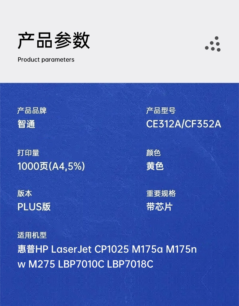 智通 CE312A/CF352A 粉盒 PLUS版 帶芯片 黃色 1000頁(A4,5%)單支裝(適用惠普HP LaserJet CP1025 M175a M175nw M275 LBP7010C)