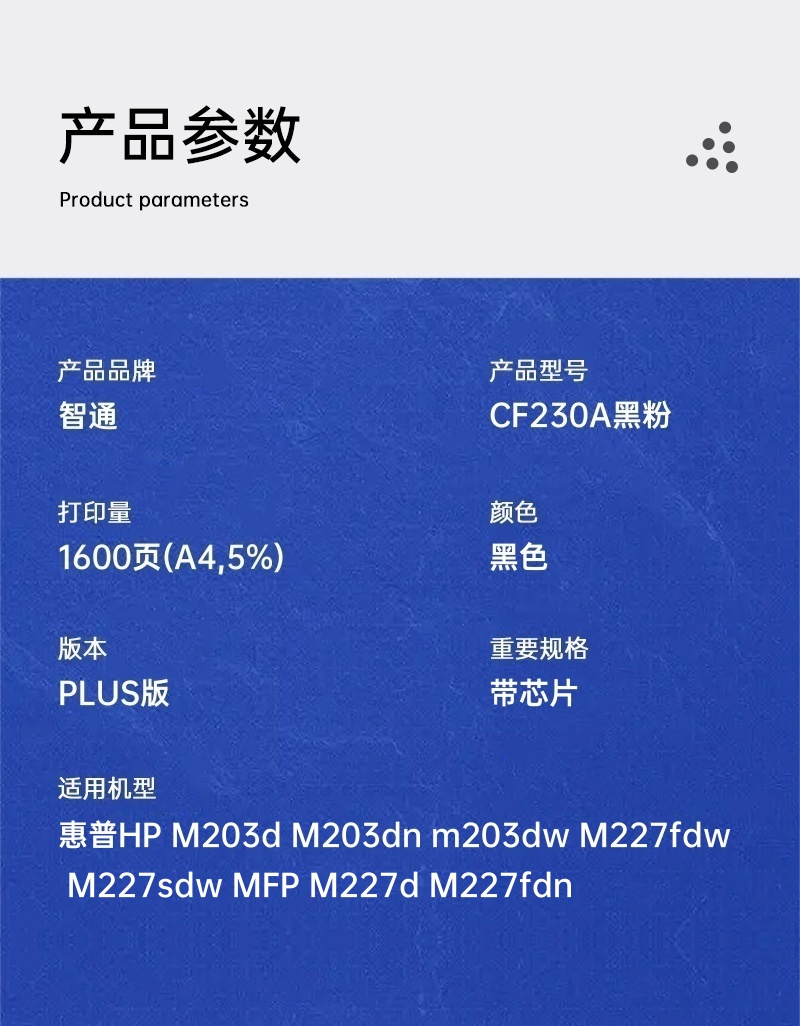 > 辦公耗材 > 打印機(jī)耗材 > 通用硒鼓 > 智通 CF230A 粉盒 PLUS版 帶芯片 黑色 1600頁(A4,5%)單支裝 (適用惠普HP M203d M203dn m203dw M227fdw M227sdw MFP M227d M227fdn)智通 CF230A 粉盒 PLUS版 帶芯片 黑色 1600頁(A4,5%)單支裝 (適用惠普HP M203d M203dn m203dw M227fdw M227sdw MFP M227d M227fdn)