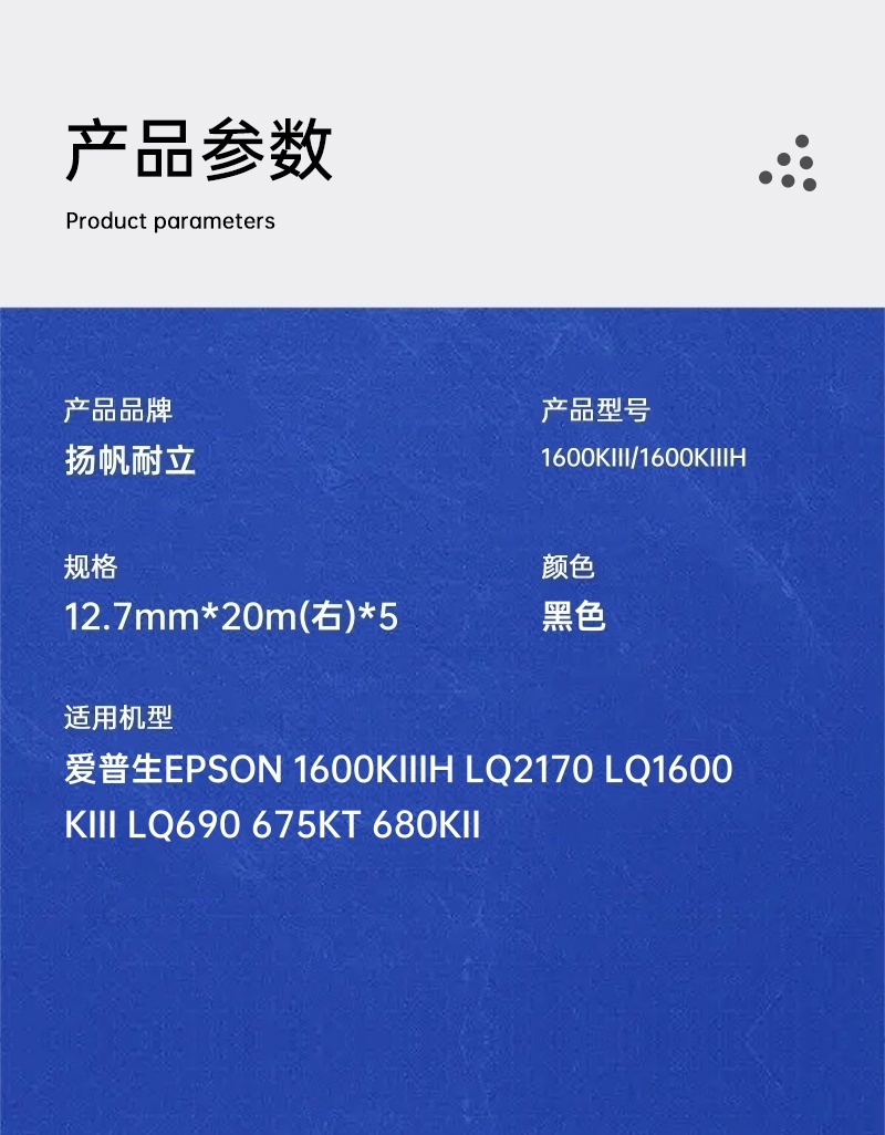 > 辦公耗材 > 復(fù)印機耗材 > 通用色帶芯 > 揚帆耐立 1600KⅢ/1600KⅢH 色帶芯 5支裝/盒 黑色 12.7mm*20m(右)*5適用于愛普生EPSON 1600KIIIH LQ2170 LQ1600KIII LQ690 675KT 680KII揚帆耐立 1600KⅢ/1600KⅢH 色帶芯 5支裝/盒 黑色 12.7mm*20m(右)*5適用于愛普生EPSON 1600KIIIH LQ2170 LQ1600KIII LQ690 675KT 680KII