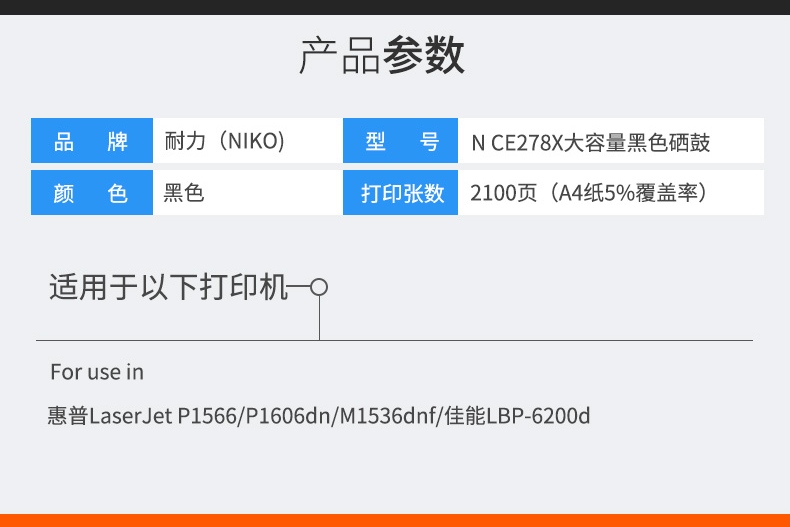 > 辦公耗材 > 打印機(jī)耗材 > 通用硒鼓 > 耐力(NIKO)N CE278X 大容量 黑色硒鼓 (適用惠普 LaserJet P1566/P1606dn/M1536dnf,佳能 LBP-6200d)耐力(NIKO)N CE278X 大容量 黑色硒鼓 (適用惠普 LaserJet P1566/P1606dn/M1536dnf,佳能 LBP-6200d)
