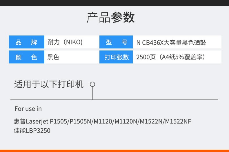 > 辦公耗材 > 打印機(jī)耗材 > 通用硒鼓 > 耐力(NIKO)N CB436X 大容量 黑色硒鼓 (適用惠普 LaserJet P1505N/M1522N/M1120/佳能LBP-3250)耐力(NIKO)N CB436X 大容量 黑色硒鼓 (適用惠普 LaserJet P1505N/M1522N/M1120/佳能LBP-3250)
