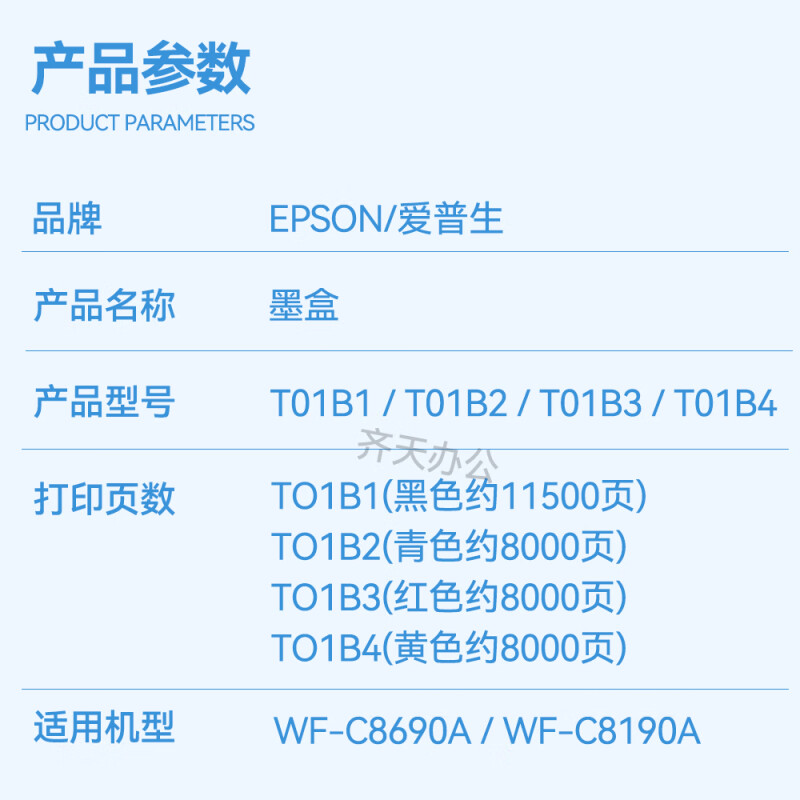 > 辦公耗材 > 打印機(jī)耗材 > 原裝墨盒 > 愛(ài)普生原裝愛(ài)普生T01B黑色彩色墨盒 WF-C8190a/WF-C8690a打印機(jī)墨水盒 原裝T01B1黑色墨盒【約11500頁(yè)】